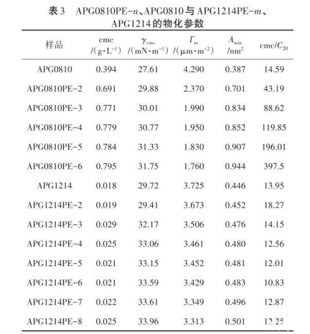 由表3可以看出,APG0810PE-n的cmc、γcmc、Amin均高于APG0810,且隨著PO添加量的增加而增大,PO基團的引入增加了分子的空間位阻以及被吸附分子在氣/液界面所占的面積。因此,Гm會隨之降低,并且隨著PO基團的增加降低得更明顯。同樣,對于APG1214PE-m也有相同的趨勢。