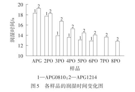 由圖5可以看出,APG0810PE-n和APG1214PEm的潤濕時間隨著PO加合數的增加而減少。這是因為表面活性劑在濕潤帆布片時,PO基團的引入為分子提供疏水性,提高了分子與帆布片之間的疏水相互作用,促使分子易于吸附在帆布片表面,有利于潤濕。而APG1214和APG1214PE-m的潤濕時間比APG0810和APG0810PE-n長,說明隨著碳鏈增長,潤濕性能變差,這是因為分子長度增加打破了親水親油平衡狀態,不利于潤濕。
