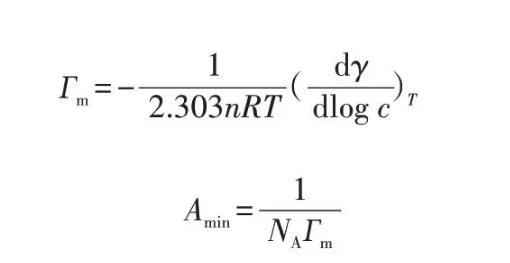 其中:T表示絕對溫度,通常取298 K;R表示氣體常數,通常取8.314 J/(mol·K);NA表示阿伏加德羅常數,通常取6.022×1023;n也表示常數,對于離子表面活性劑n取2,對于非離子表面活性劑n取1;dγ/dlogc是指在恒溫情況下,表面張力γ隨表面活性劑濃度對數logc變化的變化率。