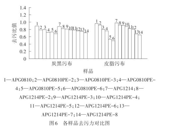 污垢通過不同的相互作用力在物品表面附著,而應用表面活性劑去除的污垢一般是通過物理吸附(范德華力、偶極相互作用)或者靜電作用而附著于物品上。去污力是指將固體表面浸泡在一定的液體介質中去除污垢的能力,使用洗滌劑減少污垢在固體表面的附著量,利用機械力使污垢與固體表面分離。由圖6可以看出,無論是皮脂污布還是炭黑污布,制備的APG0810PE-n和APG1214PE-m的去污比值都低于對應的原料APG0810和APG1214,而且隨著PO加合數的增加而降低,可能是由于PO基團的引入使得分子的疏水性提高。但整體來看,PO改性APG獲得的產品去污性能仍處于較好的水平。