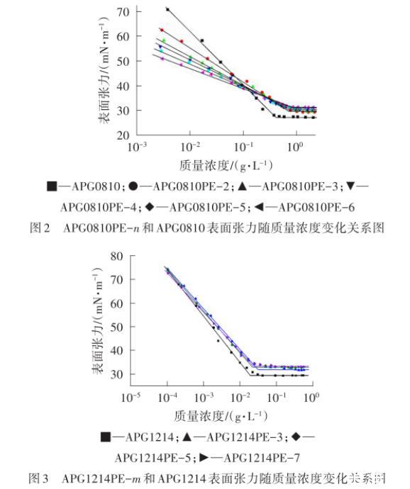 平衡表面張力揭示了表面活性劑降低溶劑(通常是水)表面張力的能力。表面活性劑的許多應用都與平衡表面張力有關,例如起泡作用、潤濕作用、鋪展作用等。圖2為APG0810PE-n和APG0810平衡表面張力隨著質量濃度變化的關系圖,圖3、圖4為APG1214PE-m和APG1214平衡表面張力隨著質量濃度變化的關系圖,相應的物化性能參數列于表3。