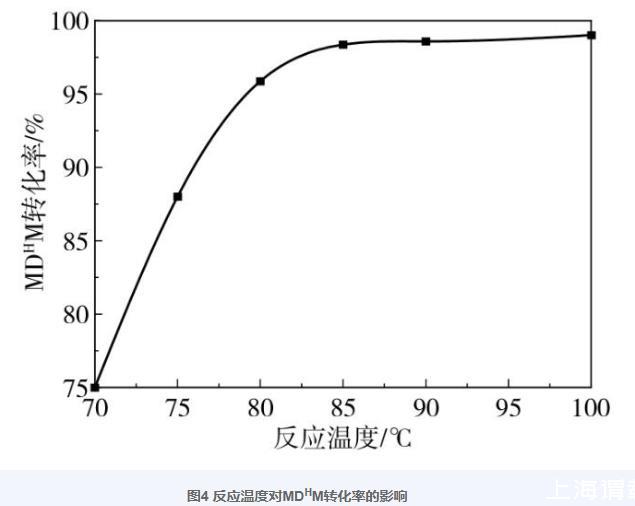 在n(BEO)∶n(MDHM)為1.05∶1、三氯化釕催化劑的用量為30 mg/kg、反應溫度100℃的條件下,考察反應時間對MDHM轉化率的影響,結果如圖5所示。由圖5可知,隨著反應時間的增加,MDHM轉化率逐漸增大,當反應時間為6.0 h時轉化率最大,繼續增加反應時間MDHM轉化率沒有提高,并且增加了生產成本及能源消耗。因此,本文確定適宜的反應時間為6.0 h。