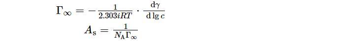 為了更全面地研究表面活性劑溶液性質,采用Gibbs吸附公式建立了表面吸附量和表面張力及活度之間的關系,根據表面活性劑表面張力變化曲線,可利用其得出表面飽和吸附量(?!蓿?,由于表面活性劑溶液濃度很小,趨近于稀溶液,其活度可約等于濃度。再通過與阿伏伽德羅常數的數量關系,計算每個吸附分子在溶液表面所占的平均面積(AS)。因此可由如下公式計算: