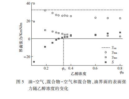 乙醇的初始濃度是本實(shí)驗(yàn)中的一個(gè)關(guān)鍵參數(shù)。在實(shí)驗(yàn)中我們觀察到當(dāng)乙醇初始濃度φ0大于一臨界濃度φc時(shí),液滴出現(xiàn)不穩(wěn)定性。為了解釋不穩(wěn)定性的發(fā)生,本文測(cè)量了相應(yīng)油~空氣、混合空氣和混合油界面的界面張力γoa、γma和γmo.圖5顯示了油~空氣、混合物~空氣和混合物~油界面的表面張力隨乙醇濃度的變化。油~空氣的界面張力γoa不變,混合物~空氣界面張力γma和混合物~油的界面張力γmo隨液滴中乙醇含量增大而減小。定義擴(kuò)散參數(shù)S=γoa-γma-γmo.當(dāng)擴(kuò)散參數(shù)為正值時(shí),液滴會(huì)擴(kuò)散到油(疏水性液體)上,發(fā)現(xiàn)該標(biāo)準(zhǔn)與液滴不穩(wěn)定性的開始一致。隨著乙醇初始含量φ0增大,S會(huì)逐漸增大,存在一個(gè)臨界乙醇含量φc,且φc處S=0,因此可認(rèn)為:只有乙醇的初始含量大于φc時(shí),才會(huì)發(fā)生“液滴爆炸”現(xiàn)象。