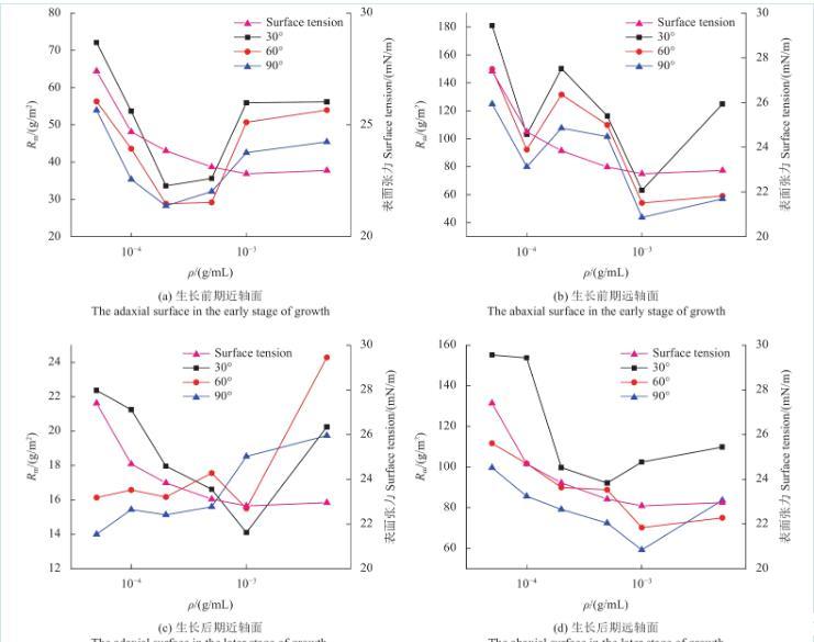圖5為不同質量濃度Triton X-100溶液在蘋果葉片近、遠軸面的Rm變化規律。從中可以看出,不同傾角下蘋果葉片生長前期近、遠軸面的Rm值和表面張力均隨溶液質量濃度的升高而不斷減小,當Triton X-100溶液質量濃度達到cmc時,近軸面Rm值與表面張力的變化趨于平緩,而遠軸面的Rm值則出現大幅波動。其原因可能與Triton X-100表面活性效率高(cmc=1.32×10?4 g/mL)有關,同時溶液色散分量占比會隨溶液質量濃度的升高而提高,而對蘋果葉片遠軸面表面自由能起主導作用的也是色散分量,以上多重因素導致遠軸面的Rm值產生波動。蘋果葉片生長后期Rm與表面張力隨溶液質量濃度的變化與生長前期相似。