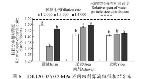 該試驗(yàn)條件下霧滴體積中徑在390~455m范圍內(nèi),根據(jù)ASABE S572.1標(biāo)準(zhǔn),噴霧品質(zhì)屬于中等偏下的Coarse、Very Coarse等級,在濕潤葉片表面滯留能力較弱。霧滴粒徑相對分布如圖6所示,結(jié)果表明,助劑的加入使霧滴粒徑相對分布跨度與水相比均有不同程度減小。