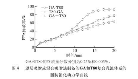 圖4逐層吸附或混合吸附法制備的GA和T80復合乳液體系的脂肪消化動力學曲線