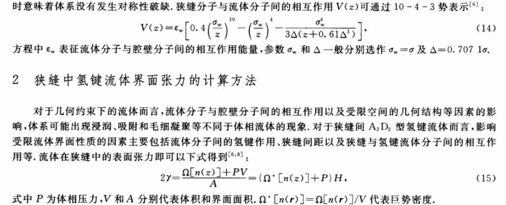 近年來,多孔材料獨特的結構和吸附特性使得其在很多領域有著廣泛的應用。自然界中大量多孔介質通常具有狹縫形狀的孔道結構,如石墨的片層結構以及巖石的解離結構等都可以通過狹縫模型予以處理。由于狹縫表面與流體分子之間的相互作用對受限流體的結構與熱力學性質有著顯著的影響,因而當狹縫的側壁兩側與流體分子之間的相互作用不同時,流體的界面張力等物理化學性質與體相有顯著差別。在分子間作用與狹縫外勢的共同作用下,受限流體會產生一系列不同于體相的相行為及界面特征。因此,狹縫間流體的吸附~脫附、溶劑化及其界面張力等性質的相關研究已經引起了學者們的廣泛研究興趣。