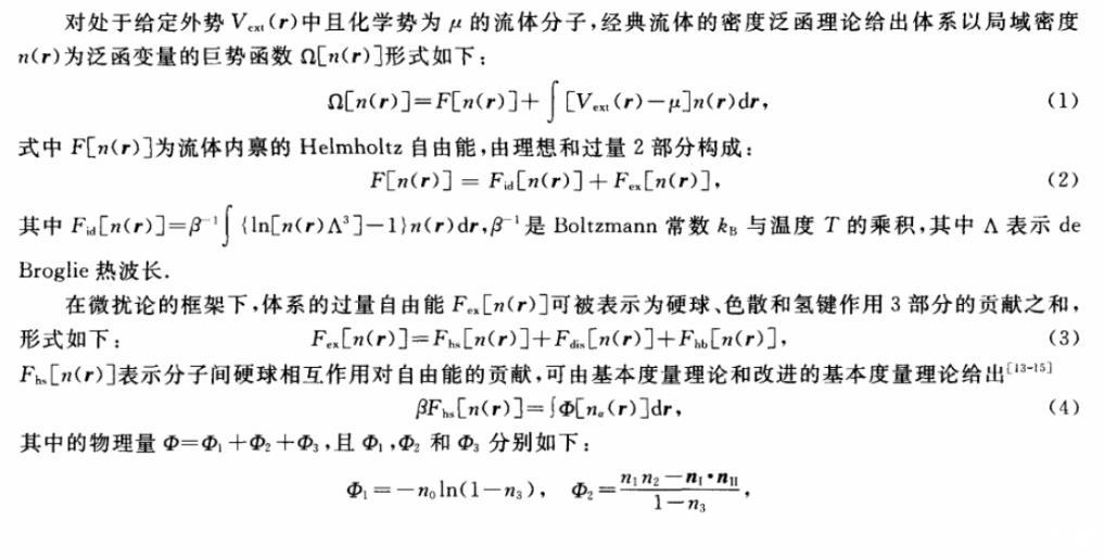 對處于給定外勢Vext(r)中且化學勢為μ的流體分子,經典流體的密度泛函理論給出體系以局域密度n(r)為泛函變量的巨勢函數Ω[n(r)]形式如下: