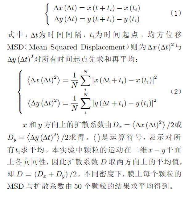 實(shí)驗(yàn)采用的亞微米顆粒為羧酸鹽修飾的聚苯乙烯熒光微球,直徑分別為0.2、0.5和1.0μm。將該熒光微球稀釋至一定濃度后裝入噴霧器,噴霧器從高處緩緩將顆粒噴灑至膜表面。為防止表面對(duì)流干擾顆粒布朗運(yùn)動(dòng)的觀測(cè),使用特氟龍圓環(huán)(外徑12 mm,內(nèi)徑6 mm,高2.5 mm)隔絕出一部分區(qū)域的膜,再蓋上蓋玻片,靜置10 h后,可基本消除表面對(duì)流。