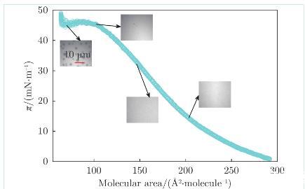 圖2為膜表面壓強(qiáng)隨膜密度的變化曲線,(以DPPC磷脂分子所占平均面積作為衡量膜密度的物理量)。在顯微鏡下觀察了膜在不同密度下的形貌(圖2中4張照片)。膜被壓縮到100?2/molecule之前,處于液態(tài)擴(kuò)張(Liquid Expanded,LE)相,磷脂分子排列較松散,膜表面結(jié)構(gòu)均勻。當(dāng)膜被壓縮到60~100?2/molecule時(shí),膜上開始出現(xiàn)直徑為幾微米的磷脂凝聚(Tilted Condensed,TC)相(照片中斑點(diǎn)),TC區(qū)域內(nèi)磷脂分子的排列比LE區(qū)域更緊密。熒光劑Texas red DHPE傾向于分布在LE區(qū)域,因此LE區(qū)域顯示為淺色,TC區(qū)域顯示為深色。膜繼續(xù)被壓縮,在LE?TC共存相階段,膜表面壓強(qiáng)恒定在45 mM/m左右,TC區(qū)域數(shù)量和面積占比增大。當(dāng)膜被進(jìn)一步壓縮(<60?2/molecule),此時(shí)膜表面幾乎被TC區(qū)域占據(jù),TC區(qū)域相互擠壓,導(dǎo)致膜表面壓強(qiáng)直線上升,LE區(qū)域僅存在于TC區(qū)域之間的空隙。