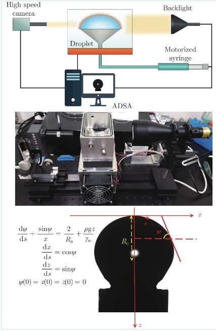 采用課題組自主研發(fā)的約束液滴表面測(cè)量?jī)x(Constrained Drop Surfactometry,CDS)測(cè)量膜在不同密度下的表面張力,如圖1所示,圖中x與z分別代表水平與豎直方向,s代表液滴表面切向方向,ψ為液滴表面與水平方向內(nèi)夾角,R0為液滴半徑,ρ為液滴密度,g為重力加速度。CDS上的圓形基座用于盛放純水液滴(約10μL),以微量進(jìn)樣針將稀釋的固爾蘇–氯仿溶液滴定到液滴表面,形成形狀類似于肺泡的水?氣界面固爾蘇肺表面活性劑膜。基座中央的小孔通過(guò)導(dǎo)管與注射器相連,注/抽水速度由Labview編程的推進(jìn)器控制,以此調(diào)節(jié)液滴表面積的變化速率。實(shí)驗(yàn)測(cè)量的是膜在壓縮過(guò)程中表面張力與膜密度變化的關(guān)系,液滴表面積以0.05的準(zhǔn)靜態(tài)速率縮小。液滴的輪廓由照相機(jī)拍攝。膜表面張力和表面積以ADSA(Axisymmetric Drop Shape Analysis)方法分析得出。膜表面壓強(qiáng),其中,純水表面張力。