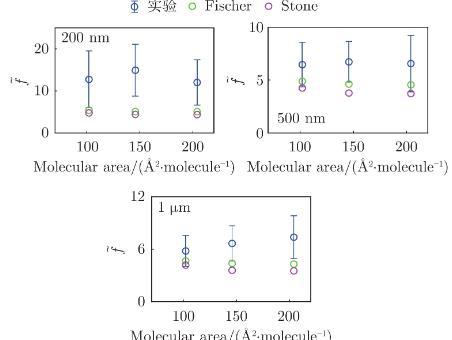 2)在LE相表面結構均勻的膜上,顆粒阻力系數等于水動力學阻力系數與熱力學毛細波界面擾動表面張力阻力系數之和。其中,界面擾動表面張力需體現膜的黏彈性及微納尺度,因此加入了黏彈性項以及熱力學毛細波波數項。利用熱力學毛細波波長擬合實驗測量值發現,約等于膜內主要成分DPPC磷脂分子的平均間距,符合熱力學界面擾動的理論描述。