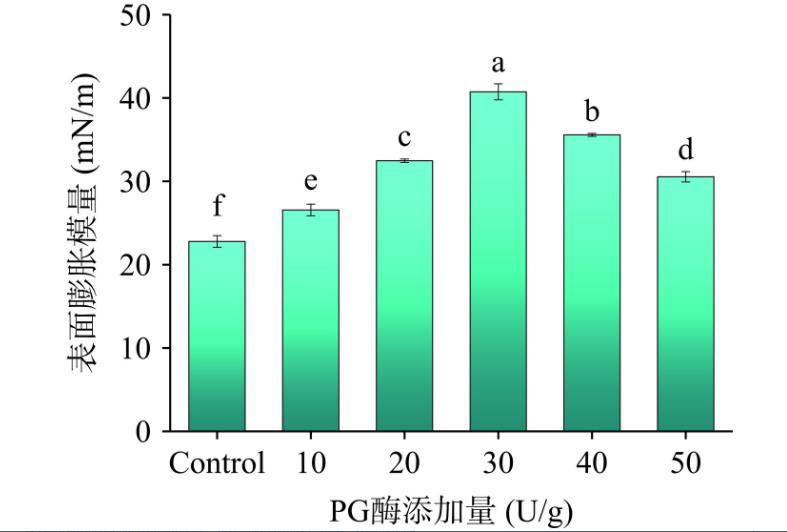 表面膨脹流變學(xué)是一個(gè)重要的表征,通過(guò)其可以確定吸附在氣-水界面的蛋白質(zhì)的相互作用。如圖2所示,隨著PG添加量的增大,脫酰胺玉米醇溶蛋白的表面膨脹模量呈現(xiàn)先增大后減小的趨勢(shì)。當(dāng)加酶量達(dá)到30 U/g時(shí)蛋白質(zhì)的表面膨脹模量達(dá)到了最大40.74 mN/m。這可能是因?yàn)檫m度的脫酰胺,增強(qiáng)了蛋白質(zhì)分子柔性,形成了致密的三維網(wǎng)狀結(jié)構(gòu),疏水性基團(tuán)暴露,蛋白質(zhì)分子之間的相互作用加強(qiáng),從而增強(qiáng)了蛋白質(zhì)在吸附層薄膜的穩(wěn)定性。當(dāng)PG量繼續(xù)增加時(shí),蛋白質(zhì)網(wǎng)絡(luò)結(jié)構(gòu)塌陷,重新形成了聚集體,疏水相互作用減弱使蛋白質(zhì)界面膜的穩(wěn)定性變差。