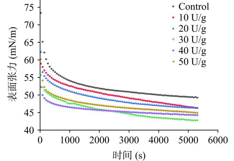 圖1脫酰胺對(duì)玉米醇溶蛋白氣-水動(dòng)態(tài)表面張力的影響