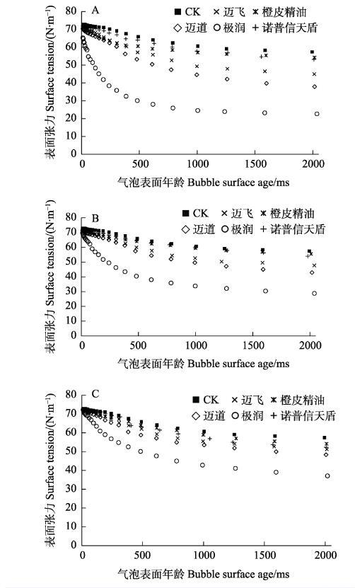 2.2不同助劑對乙基多殺菌素藥液動態表面張力的影響