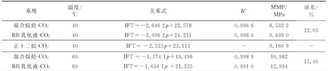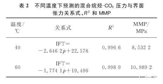 將擬合直線向橫軸方向繼續(xù)延伸,與壓力軸會有一個交點,該交點的物理意義即界面張力為零時的壓力大小。根據(jù)CO2的驅油機理和最小混相壓力所表現(xiàn)的特征,該點的橫坐標值即為實驗對象在特定溫度下的MMP。表2列出了40℃和60℃下所測氣液之間的壓力與界面張力的關系式和相關系數(shù),以及對最小混相壓力的預測。