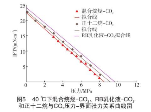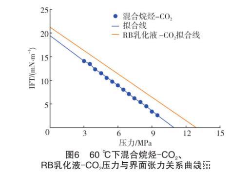 假設RB乳化液-原油不考慮斜率變化部分,始終以低壓階段(小于6 MPa)的斜率表示界面張力的變化。將表中同一溫度下不同系統(tǒng)的關系式展現(xiàn)在曲線圖上(見圖5和圖6)。從圖5和圖6可知,不論在哪個溫度下,混合烷烴和RB乳化液的壓力-界面張力曲線都接近平行,即兩種油的界面張力隨著壓力的升高幾乎以同樣的速度降低。計算得知,40℃和60℃下實驗混合烷烴和RB原油的壓力-界面張力關系式中的斜率誤差為6.0%和8.6%??v觀兩種油的組成發(fā)現(xiàn),本實驗所使用的混合烷烴中正十二烷的摩爾分數(shù)達71.07%,而RB原油中的C12+的摩爾分數(shù)達到57.66%。也就是說,混合烷烴和原油的組分中占主導作用的是高碳數(shù)的正構烷烴。據(jù)姬澤敏等的大量實驗研究,界面張力在不同的正構烷烴-CO2體系中具有極好的規(guī)律性,在相同的溫度壓力條件下,正構烷烴的碳數(shù)和界面張力成正比關系。從文獻中RB原油組成分析得知,C12+的分子量高達366 g/mol,而本實驗中的混合烷烴的分子量僅為156.74 g/mol。由此得知,實驗誤差的主要來源是高碳正構烷烴的組成不同。