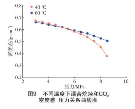 一方面,高溫可以對液體分子之間的相互作用力產生削弱作用,加劇分子間的不規(guī)則運動。此時,CO2氣體分子更容易與液相發(fā)生混溶,而定量表現(xiàn)出來的就是界面張力的降低。另一方面,根據(jù)混合烷烴和CO2的密度和二者的密度差數(shù)據(jù),繪制出不同溫度下CO2氣體密度和氣液密度差隨壓力升高的變化曲線,如圖7~圖9所示。從密度差-壓力曲線(見圖9)來看,隨著溫度升高,在可比較的實驗壓力范圍內,中低壓(3~6 MPa)下不同溫度的氣液密度差非常接近,可以忽略不計。但高于6 MPa后,高溫下氣液密度差逐漸加大。較高的密度差導致了氣液難以形成混相,同一壓力下界面張力更大。