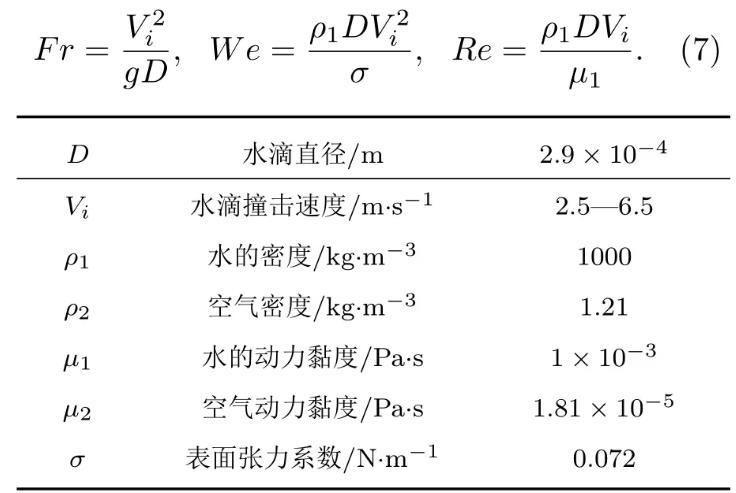 如圖1所示,水滴撞擊深水液池的數值模擬在軸對稱坐標系中進行,Y軸為計算區域的對稱軸,D為初始水滴直徑,R=D/2,正方形計算區域的長度H=20D,水滴距離液面的距離H1=0.1D,液池深度H2=12D以消除底部對液滴撞擊運動的影響,水滴在重力g和撞擊速度Vi的作用下撞擊液池。采用雷諾數、韋伯數和弗勞德數來描述液滴撞擊的運動特征,三者分別表征液體慣性力與黏滯力間的關系、液體慣性力與表面張力間的關系以及液體慣性力與重力間的關系。三個無量綱參數的表達式如(7)式所示,主要物理參數如表1所列。