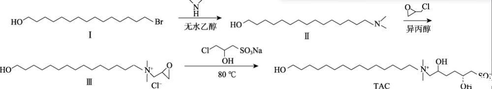本文擬以15-溴-1-十五醇、二甲胺水溶液、環(huán)氧氯丙烷、3-氯-2-羥基丙磺酸鈉為原料,通過(guò)季銨化反應(yīng)和開(kāi)環(huán)反應(yīng)制備了甜菜堿表面活性劑(TAC)。通過(guò)聚合物和表面活性劑分子的疏水單元組成的混合膠束與聚合物主鏈發(fā)生物理交聯(lián),從而產(chǎn)生擴(kuò)展的聚合物網(wǎng)絡(luò),以期改善稠化酸的耐溫、耐剪切性能,提高180℃高溫地層的油氣采收率。