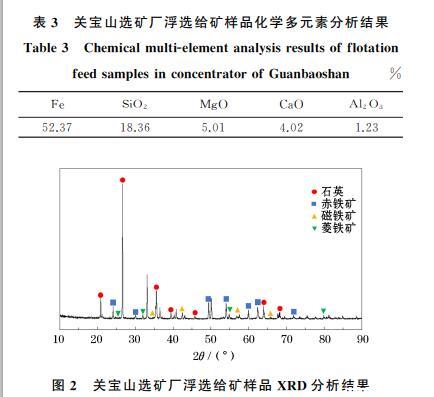 試驗(yàn)所用礦石為關(guān)寶山鐵礦,具有礦物組成復(fù)雜、嵌布粒度細(xì)、分選難度大等特點(diǎn)。關(guān)寶山選礦廠浮選給礦樣品經(jīng)自然陰干后進(jìn)行混勻縮分取樣,其化學(xué)多元素分析結(jié)果見表3.由表3可知,浮選給礦中Fe含量為52.37%,脈石礦物以含硅礦物為主,SiO2含量為18.36%;其次為含鈣及含鎂礦物,MgO、CaO含量分別為5.01%、4.02%.關(guān)寶山選礦廠浮選給礦樣品XRD分析結(jié)果如圖2所示。由