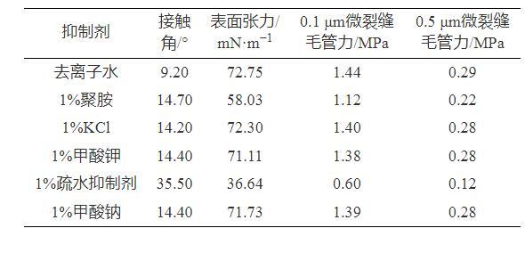 同時從表1中可以看出,疏水抑制劑能夠有效降低溶液的表面張力,當微裂縫的寬度為0.1μm時,微裂縫對于去離子水的毛管自吸力達到1.44 MPa,而加入疏水抑制劑后可以降低至0.60 MPa,而且隨著微裂縫寬度增加毛管自吸力逐漸降低。納米級別的微裂縫具有較高毛管自吸力,所以在體系構(gòu)建時應(yīng)封隔頁巖微納米級裂縫和加入疏水類的處理劑,弱化微納米級裂縫的毛管自吸力。