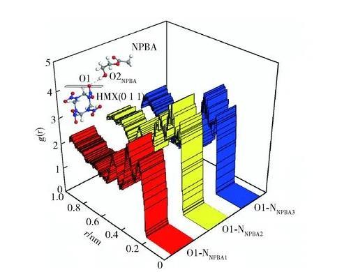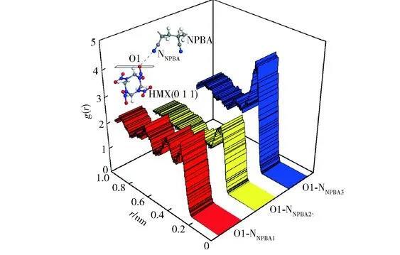 HMX(0 1 1)晶面上—NO2基團(tuán)中氧原子O1與NPBA分子鏈上—CN基團(tuán)上氮原子NNPBA之間的徑向分布函數(shù)曲線見(jiàn)圖3.