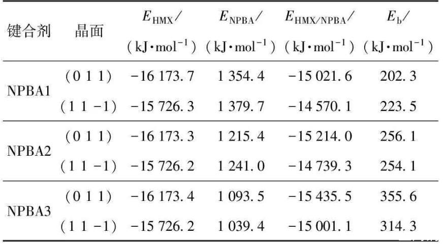 結(jié)合能是表征混合體系組分間相互作用力強(qiáng)度的特征參數(shù),HMX吸附NPBA界面模型的結(jié)合能越大,表明界面間的相互作用越強(qiáng)。結(jié)合能Eb=(EHMX+ENPBA)-EHMX/NPBA,其中EHMX、ENPBA和EHMX/NPBA分別為界面模型中HMX晶面、NPBA以及界面模型的平均單點(diǎn)能。6種界面模型結(jié)合能的模擬計(jì)算結(jié)果見(jiàn)表2.