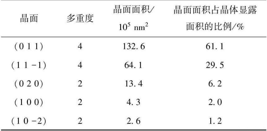 由于HMX以晶體形式存在,因此建立HMX吸附NPBA界面模型前,需先確定與NPBA分子產(chǎn)生作用的具體晶面。為此,選用與實(shí)驗(yàn)結(jié)果吻合較好的Growth Morpholog方法,計(jì)算得到了HMX的晶體形貌,為棱柱狀晶體(見(jiàn)圖2),其主要晶面及參數(shù)見(jiàn)表1.