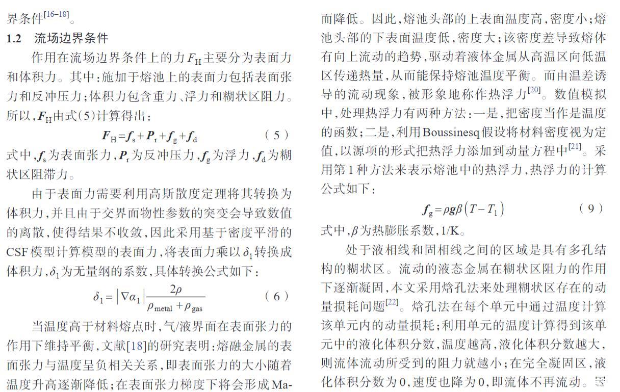 作用在流場(chǎng)邊界條件上的力FH主要分為表面力和體積力。其中:施加于熔池上的表面力包括表面張力和反沖壓力;體積力包含重力、浮力和糊狀區(qū)阻力。所以,F(xiàn)H由式(5)計(jì)算得出: