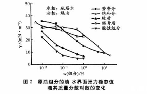 圖2原油組分的油-水界面張力穩態值隨其質量分數對數的變化