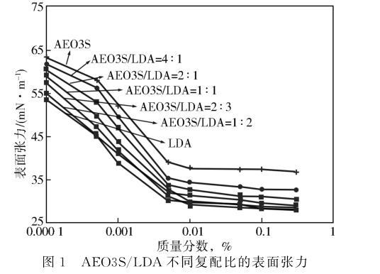 在25℃測試了AEO3S和烷醇酰胺LDA表面活性劑及其在不同質(zhì)量配比下溶液的表面張力,實驗結(jié)果見圖1。根據(jù)相對分子質(zhì)量計算出表面活性劑AEO3S的摩爾分數(shù)(αAEO3S)。由圖1中濃度與表面張力的關(guān)系得到溶液的CMC及對應濃度下的表面張力,實驗結(jié)果見表1。