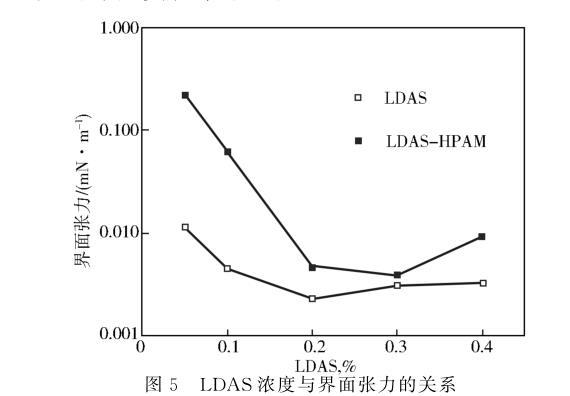 由圖5可知,無論溶液有無聚合物存在,隨著復(fù)配表面活性劑LDAS濃度的增加界面張力呈現(xiàn)先下降而后略有增加的現(xiàn)象。無聚合物時(shí),活性劑LDAS濃度在0.1%~0.4%時(shí)界面張力均處于超低界面張力范圍;加入0.12%HPAM后,油水界面張力略有上升,但0.2%和0.3%LDAS溶液與魏崗原油間的界面張力仍然很低,分別為0.003 8 mN/m和0.004 5 mN/m,表明復(fù)配表面活性劑體系具有很高的界面活性。