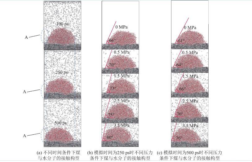 通過對比瓦斯壓力為3.5 MPa條件下,模擬時間為100、250、500 ps時,煤與水分子接觸構型(圖13a)可以獲得如下規律:隨著時間的增加,水分子逐漸在煤表面鋪展,接觸面寬度逐漸增加,通過觀察圖13a中的區域A可以明顯發現此規律。通過對比同一瓦斯壓力、不同時間條件下,煤與水分子接觸構型(圖13b—圖13c)發現:隨著時間的增加,煤與水分子之間的接觸角逐漸減小。綜合分析可知,在同一瓦斯壓力條件下,隨著時間的增加,水分逐漸在煤體表面鋪展,水與煤之間的接觸角逐漸減小。通過對比同一時間條件下(圖13b—圖13c)可知,隨著瓦斯壓力的增加,煤與水分子之間的接觸角逐漸增加,其原因是瓦斯壓力越大,水分子越不易在煤表面鋪展且不易進入煤中,水分越不容易潤濕煤。