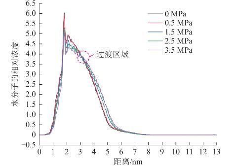 基于不同瓦斯壓力條件下、動力學模擬時間為500 ps時,煤與水分子的分子動力學模擬結果,對不同瓦斯壓力條件下水分子沿Z軸的相對濃度進行計算,即可獲得不同瓦斯壓力條件下,水分子的相對濃度(一定法向距離范圍,水分子數密度與系統內水分子總數密度的比值)分布如圖14所示。