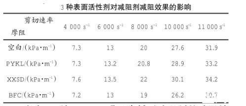 選用HLBT減阻劑,測試了3種表面活性劑對減阻劑減阻效果的影響(見表3)。