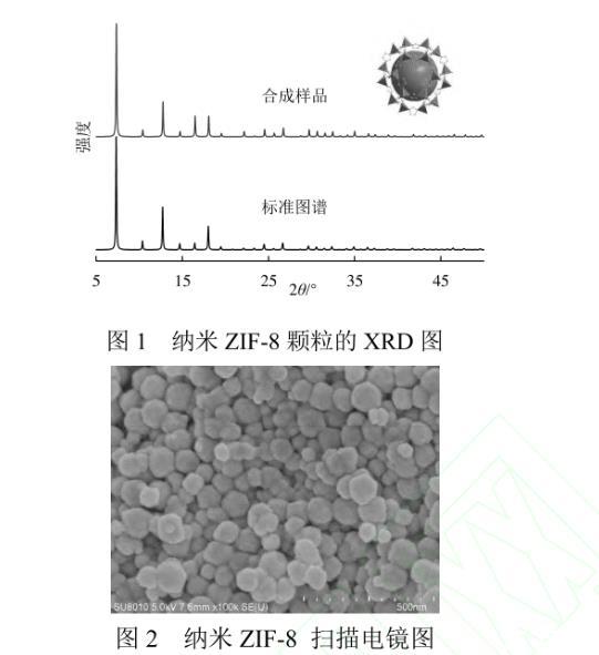納米ZIF-8顆粒的XRD譜圖如圖1所示。合成的樣品譜圖分布與標(biāo)準(zhǔn)譜圖匹配,且所獲得的衍射峰與文獻(xiàn)吻合,未出現(xiàn)雜峰,表明制備的樣品具有單一相且結(jié)晶度良好。由謝樂(lè)公式計(jì)算得到晶粒尺寸約為70 nm。由納米ZIF-8顆粒的掃描電鏡照片可見(jiàn),ZIF-8顆粒形貌為六邊形,平均尺寸為65.8 nm,與XRD計(jì)算結(jié)果一致。