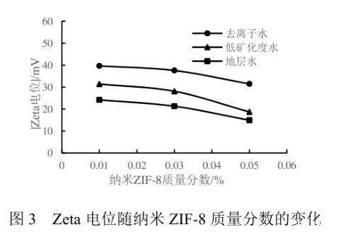 納米ZIF-8流體的穩(wěn)定性是評(píng)價(jià)其能否作為驅(qū)油劑的重要性質(zhì)之一。將裝有不同濃度納米流體的樣品瓶靜置15 d后,當(dāng)ZIF-8的質(zhì)量分?jǐn)?shù)為0.01%、0.03%時(shí),納米顆粒在不同礦化度的流體中均保持穩(wěn)定狀態(tài),無(wú)沉淀生成,說(shuō)明適當(dāng)濃度的納米ZIF-8顆粒在水中有著良好的穩(wěn)定性。當(dāng)ZIF-8的質(zhì)量分?jǐn)?shù)為0.05%時(shí),靜置后的納米流體產(chǎn)生了少量沉淀,表明過(guò)高濃度的ZIF-8會(huì)互相聚結(jié),導(dǎo)致顆粒變大,進(jìn)而發(fā)生聚沉。