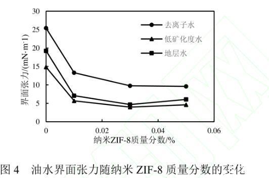 用不同礦化度水制備的納米ZIF-8流體與模擬油間的界面張力隨ZIF-8加量的變化如圖4所示。未加入納米粒子時(shí),3種礦化度水與原油間的界面張力分別為25.41、19.23和14.84 mN/m。適當(dāng)稀釋地層水的礦化度可以降低油水間界面張力,這與文獻(xiàn)報(bào)道的結(jié)果一致。添加0.01%~0.05%納米ZIF-8后,納米流體與原油間的界面張力均明顯降低。其中,納米ZIF-8加量為0.03%的低礦化度水的油水界面張力值為3.97 mN/m,比未添加ZIF-8時(shí)降低了73.25%。這是由于納米顆粒在油水間產(chǎn)生了層狀結(jié)構(gòu),使其在界面上排列更緊密,從而降低了油水界面張力。在模擬地層水中,油水界面張力隨納米ZIF-8加量的增加呈現(xiàn)先降低后增大的趨勢(shì),在加量為0.03%時(shí)達(dá)到最低。當(dāng)ZIF-8加量為0.05%時(shí),流體的穩(wěn)定性變差,部分納米顆粒可能發(fā)生聚沉現(xiàn)象,導(dǎo)致降低油水界面張力能力減弱。
