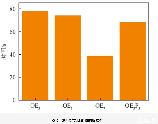 采用帆布片沉降法進行潤濕性測定過程中,帆布片在表面活性劑溶液中的沉降時間越短,潤濕力越好。0.01 mol/L油醇烷氧基化物的潤濕性如圖5所示。從圖中可以看出,隨著EO加合數的增加,OEn的潤濕時間逐漸減小,潤濕性逐漸增強。當帆布片浸入表面活性劑溶液中后,表面活性劑首先從溶液中快速遷移到纖維表面形成有效吸附層,表面活性劑的尾鏈會吸附在疏水表面上,而親水頭基朝向水相產生親水現象,有利于潤濕。EO基團為親水基,分子結構中EO基團越多,表面活性劑分子與水的相互作用越強,潤濕性越強。當在OE3中引入PO基團后,潤濕時間由78 s降低至68 s,潤濕性增強。PO基團為中等極性基團,分子中引入PO基團后,既不減弱分子的親水性又提高了其疏水性,使其與纖維的相互作用增強,同時PO基團的支化結構有利于其在織物表面的滲透,增強了潤濕性。表面活性劑分子在水溶液中遷移的速率越快(動態表面活性越強),越容易擴散到纖維表面,越有利于潤濕。油醇烷氧基化物的潤濕性順序為:OE3<OE5<OE3P3<OE7,與動態表面張力測定結果一致。