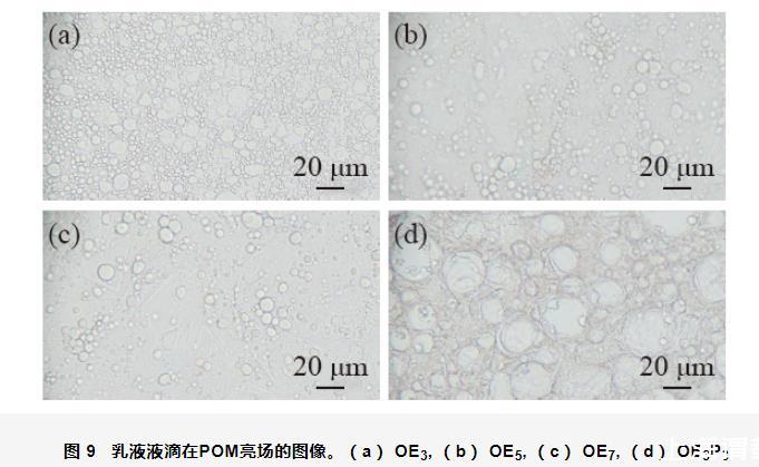 圖9(a)~(d)為分別以OE3、OE5、OE7和OE3P3為乳化劑制備的乳液液滴在POM亮場的圖像,可以發現球形液滴分散在連續的水相中,且以OE3為乳化劑形成的乳液具有均勻、細小的液滴。通過測定乳液液滴的粒徑分布可知,分別以OE3、OE5、OE7和OE3P3為乳化劑形成的乳液液滴的平均粒徑為3.65,3.95,4.66和15.34μm,即隨著OEn中EO加合數的增加,乳液粒徑的尺寸逐漸增大,且當在OE3中引入PO基團后,乳液的粒徑明顯增大且達到最大值。這可能是因為在乳液的形成過程中,油醇烷氧基化物表面活性劑分子在油/水界面定向排列可以增加液體石蠟在水中的分散性,使得液體石蠟油滴均勻分散在水中,形成細小的液滴,且表面活性劑分子定向排列形成的乳化膜可以防止乳液液滴聚并,從而可以使乳液保持較小的粒徑。但隨著油醇烷氧基化物分子結構中卷曲的EO鏈增長和支化的PO鏈的引入使得其在油/水界面的排列結構不夠緊密導致乳液粒徑變大。
