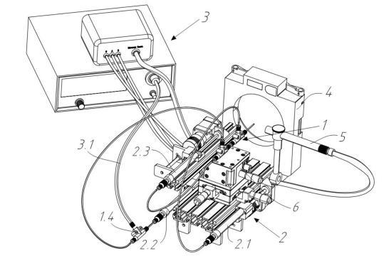 S1:通過所述集成化微流量泵控模塊2,基于預(yù)設(shè)的流速比例向樣品石英毛細(xì)管1.3輸送樣品液1.7,向內(nèi)鞘液石英毛細(xì)管1.2輸送內(nèi)鞘液1.6,向外鞘液不銹鋼管1.1輸送外鞘液1.5;