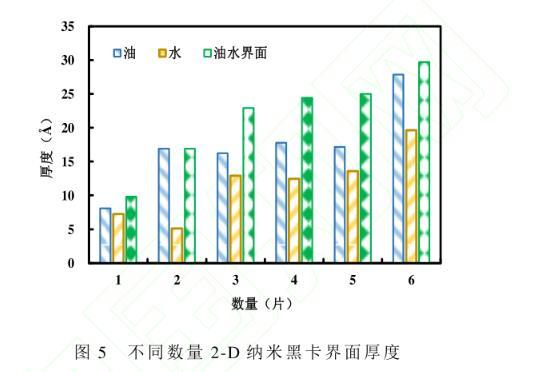 假設2-D納米黑卡全部平鋪在油水界面,其表面積與油水界面面積的比值即為界面覆蓋率(RIC)。不同數量的納米黑卡在油水體系中的界面覆蓋率和界面厚度見圖6。界面覆蓋率與界面厚度隨著納米黑卡數量的增加逐漸增加,且界面覆蓋率呈指數增加,而界面厚度呈對數增加,納米黑卡數量由1增至6時,界面覆蓋率分別為0.16、0.31、0.46、0.91、1.34和2.64。當納米黑卡數量增加到一定程度時(納米黑卡數量為4片),油水界面幾乎全部被覆蓋,界面覆蓋率在1左右,此時的界面厚度達到相對穩定的狀態,界面呈單層且平鋪吸附狀態;當黑卡數量繼續增加,界面覆蓋率指數增加,界面厚度也隨之增加,此時納米片呈受擠壓狀態,出現褶皺態和重疊疊加態,繼續增加納米黑卡數量,界面達到飽和,界面厚度不再增加,多出的黑卡分散在水溶液中,由于黑卡本身存在弱范德華相互作用,片片間不斷疊加,成為團聚態,從而形成沉淀。該沉淀物質以弱范德華相互作用團聚在一起,當遇到剪切、稀釋、振蕩等外界作用時會重新分散在水溶液中,發揮其單片的作用。