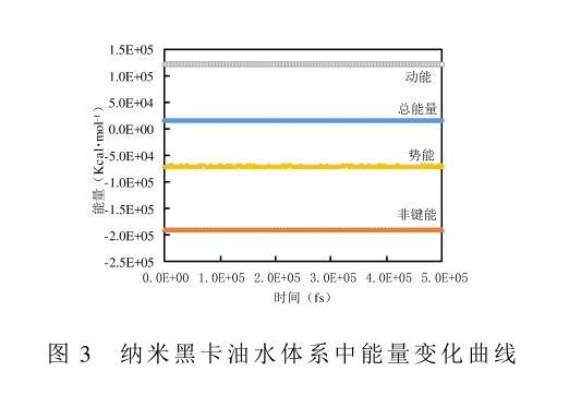 采用粒子-粒子-粒子-網格(PPPM)求解方法求解長程庫倫相互作用力。運用Polak-ribiere共軛梯度(CG)算法最小化能量,消除構型重疊。系統溫度為298 K,壓力為1 atm,系統在等溫-等壓系綜(NPT)下進行弛豫,對體系進行壓縮,使模型達到實際密度狀態。使用Nosé-hoover恒溫器控制體系溫度,時間步長1 fs,運行1 ns。然后保持系統體積不變,設置相同的時間步長和時間總長運行正則系綜(NVT)來穩定體系,以確保體系的密度不變。最后,收集體系平衡后0.5 ns范圍內的數據,得到統計平均值。應該注意的是,在每個階段運行更長時間并不會對模擬結果產生明顯的變化。模擬中水相和油相的平均密度分別為(0.989±0.008)和(0.728±0.002)g/cm3,近似實驗值(溫度為298 K、壓力為1 atm時,水和C10H22的密度分別為:0.997和0.730 g/cm3)。模擬結束后,單片納米黑卡在油水界面體系中的能量變化如圖3所示,其他體系能量變化亦有此規律。