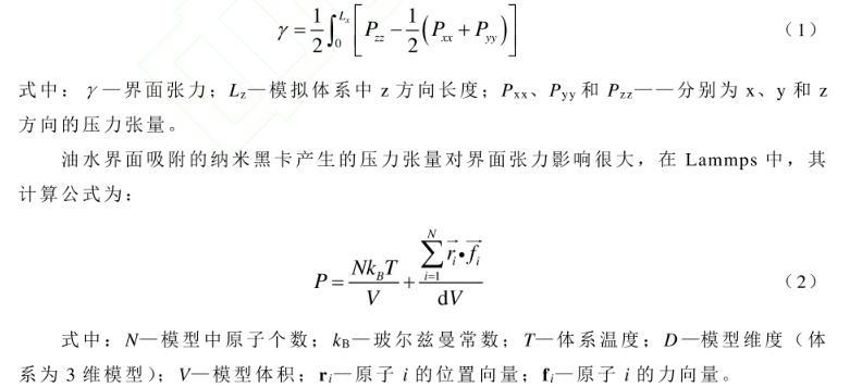 油水界面吸附的納米黑卡產生的壓力張量對界面張力影響很大,在Lammps中其計算公式為: