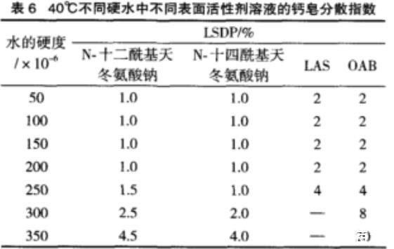 鈣皂分散的混合膠束機理認為,一個有效的鈣皂分散劑分子結構中必須包含一個大的極性親水頭基,這種“大”除了強度大外,也指體積龐大,這樣才能將肥皂分子有效隔開,使之不易形成鈣皂。N-十酰基天冬氨酸鈉和N-十四酰基天冬氨酸鈉都具有類似結構,而LAS及OAB并不具有類似結構。由表6可知,N-脂肪酰基天冬氨鈉具有優良的鈣皂分散性,N-十四酰基天冬氨酸鈉更為突出,尤其是在高硬度水中,其鈣皂分散性能更為突出,說明其在硬水中具有良好的應用前景。