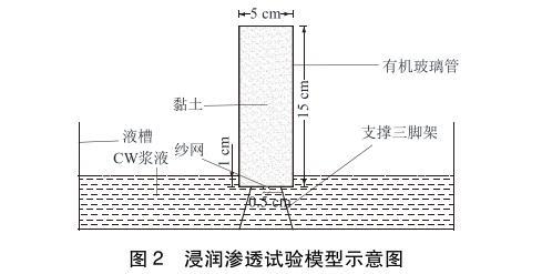 浸潤滲透試驗?zāi)P腿鐖D2所示,主要由液槽、支撐三腳架和透明有機(jī)玻璃管組成。有機(jī)玻璃管直徑5cm,高15cm,頂端敞開,底部封閉鉆有直徑0.5cm的進(jìn)漿孔。試驗時將黏土裝入有機(jī)玻璃管中,振搗壓實,底部開孔處墊有紗網(wǎng),防止土體掉落。將有機(jī)玻璃管和支撐三腳架放入漿液槽內(nèi),有機(jī)玻璃管底部浸入漿液液面以下1.0cm,使?jié){液從底部滲入黏土中,通過觀察漿液在不同時間的滲透高度來評價漿液的浸潤滲透效果。