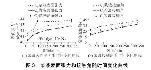 從圖3中可以發(fā)現(xiàn):3種漿液的表面張力和接觸角均隨時間的延長而變大;C1、C2的表面張力和接觸角在任何時刻均小于C0漿液的表面張力和接觸角。C1漿液的表面張力和接觸角比C2漿液的表面張力和接觸角更小。說明表面活性劑可以降低漿液的表面張力和接觸角,不同結(jié)構(gòu)的表面活性劑對漿液表面張力和接觸角的降低程度不同。