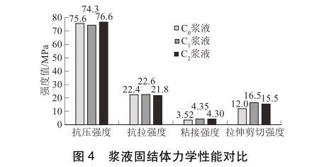 3種漿液固結(jié)體力學(xué)性能對比見圖4。由圖4可以看出:3種漿液固結(jié)體抗壓強(qiáng)度和抗拉強(qiáng)度數(shù)值差別不大,說明表面活性劑對漿液固結(jié)體的抗壓強(qiáng)度和抗拉強(qiáng)度無影響。但C1、C2漿液的粘接強(qiáng)度和拉伸剪切強(qiáng)度明顯高于C0漿液的粘接強(qiáng)度和拉伸剪切強(qiáng)度。其中C1漿液的粘接強(qiáng)度和拉伸剪切強(qiáng)度比C0漿液分別提高了23.6%和37.5%;C2漿液的粘接強(qiáng)度和拉伸剪切強(qiáng)度比C0漿液分別提高了22.2%和29.2%。其原因在于表面活性劑的加入降低了漿液的接觸角,使?jié){液有更好的浸潤性和潤濕性,從而提高了漿液的粘接強(qiáng)度和拉伸剪切強(qiáng)度。